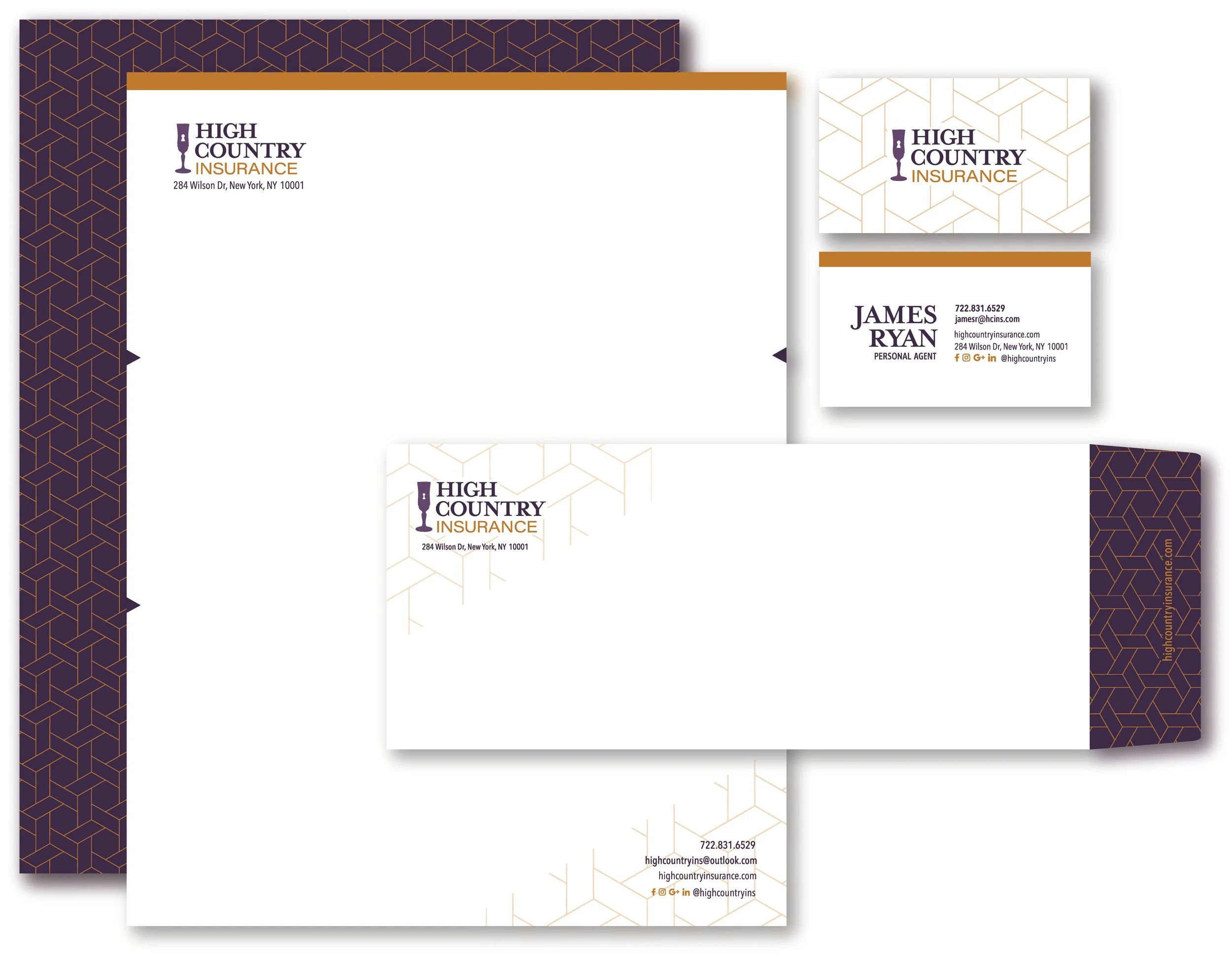 High Country Insurance’s branding was designed with the intent to reflect the company's desire to make their customers feel luxurious and valued. As they coordinate insurance plans for their clients’ high value items the strive for professionalism and class which is what they desired to communicate through their branding. These key aspects were my focus when creating their identity mark and stationery. The color palette is inspired by the traditional colors of royalty. The colors bring a sense of value and dedication to High Country’s brand.