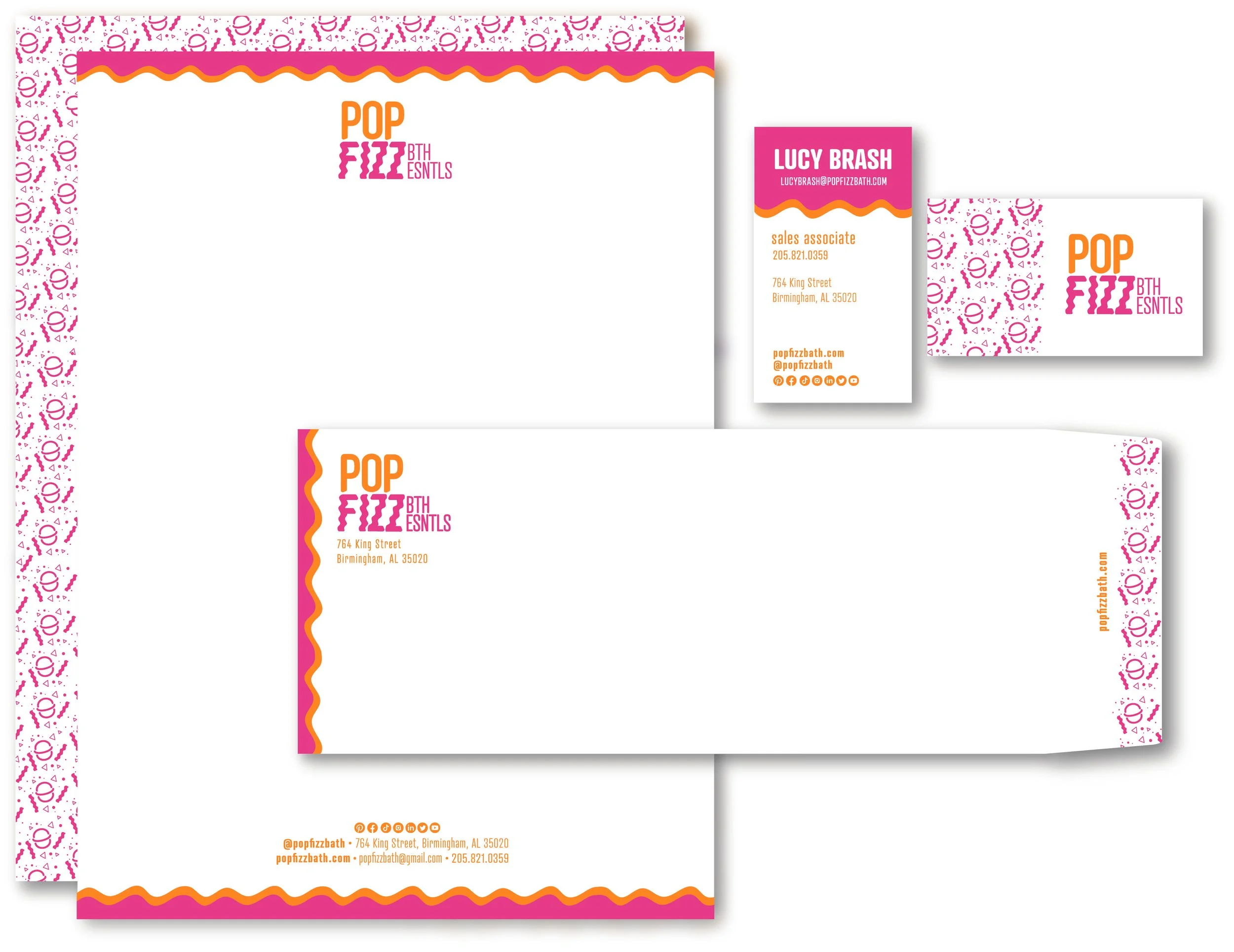 Pop Fizz Bath Essentials exhibits an irresistible spirit of fun and inclusivity, dedicated to redefining self-care with boldness and trend-setting innovation. The goal of this brand was to exude vibrancy and energy, mirroring its commitment to making every individual feel empowered and energized through self-care rituals. Inspired by the dynamic hues prevalent in bath products, the color palette is a blend of refreshing bursts of brightness, captivating the senses and embodying the essence of the brand. The typefaces chosen for their branding, Atrament, and Avenir Next Condensed, display the brand's high energy and personality.